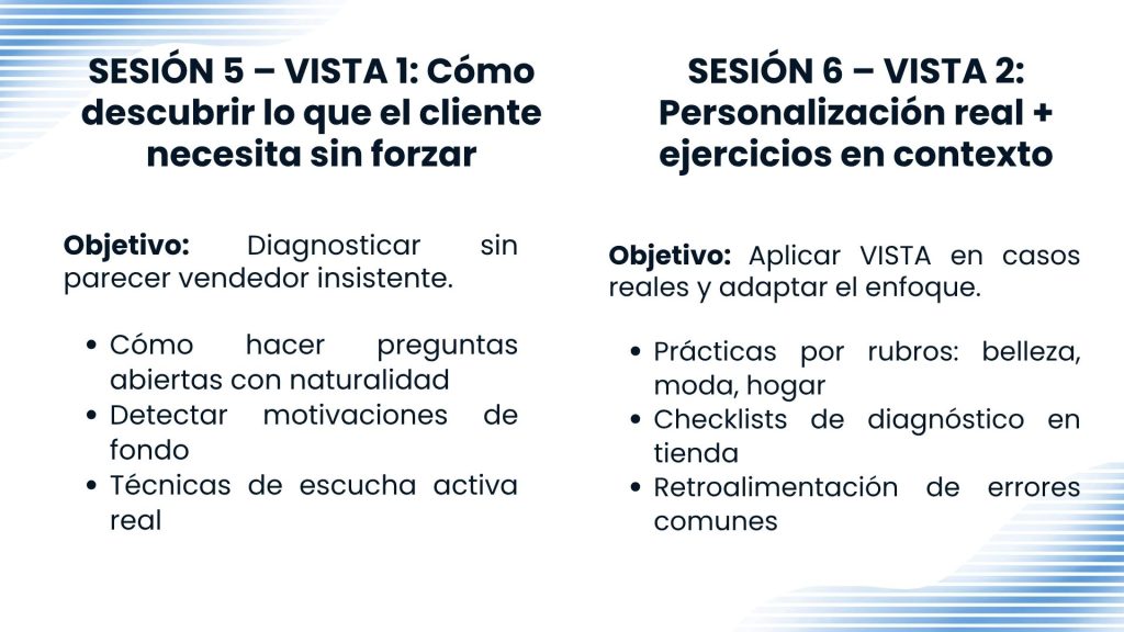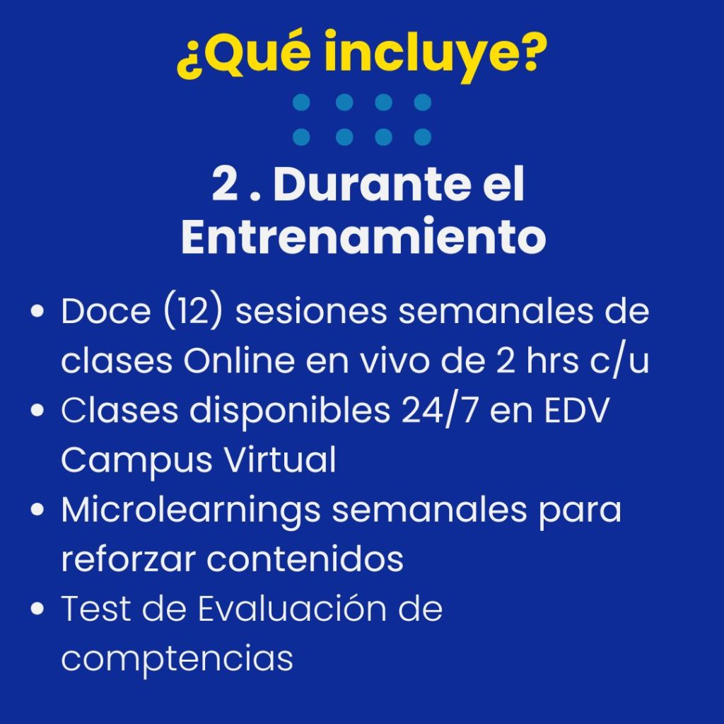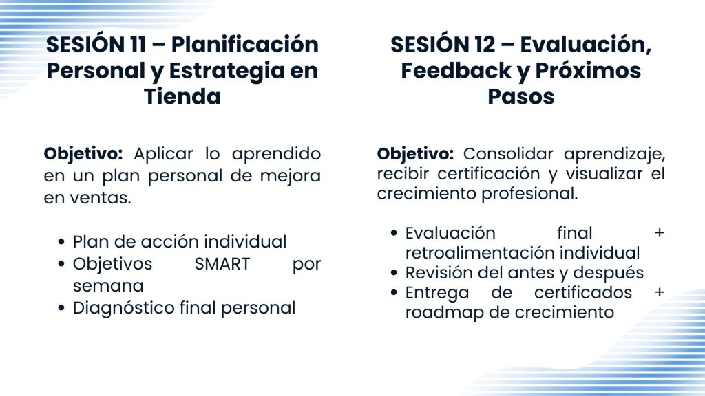 Incluye tests, tareas prácticas, evaluaciones finales y un informe estratégico post-curso con recomendaciones para seguir mejorando.